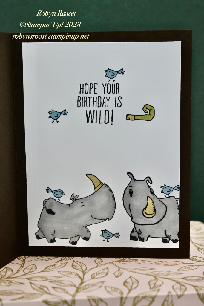 I had so much fun with the first rhino that I just had to stamp the other two rhinos from the set onto the inside of the card. The rhino on the left has the little bird on his back and I liked it so much that I stamped a whole flock of birds with the little extra bird stamp. I didn’t have room to stamp the little noise maker between the rhinos so I added it by the birthday greeting instead.