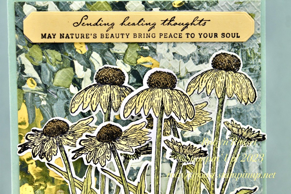 The stamp set used on this card is the Nature’s Harvest set and the bottom two flower bunches have been embossed after being adhered to the Fancy Flora paper. The shimmer ribbon was tucked under the raised flower bunch and 5 of the 2021-2023 In Color Opals were added.