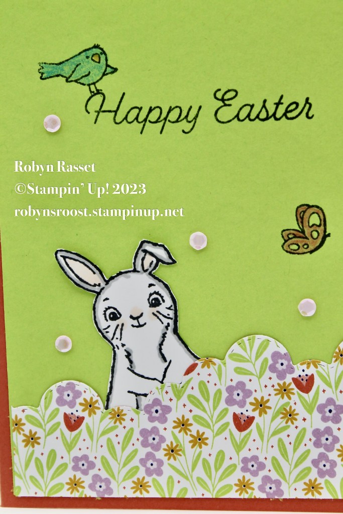 The bunny has highlights and shadows added with Light Smoky Slate and Light Petal Pink Stampin’ Blend Markers while the bird and butterfly are colored with Watercolor Pencils. A sprinkling of Adhesive Backed Sequins add some sparkle.