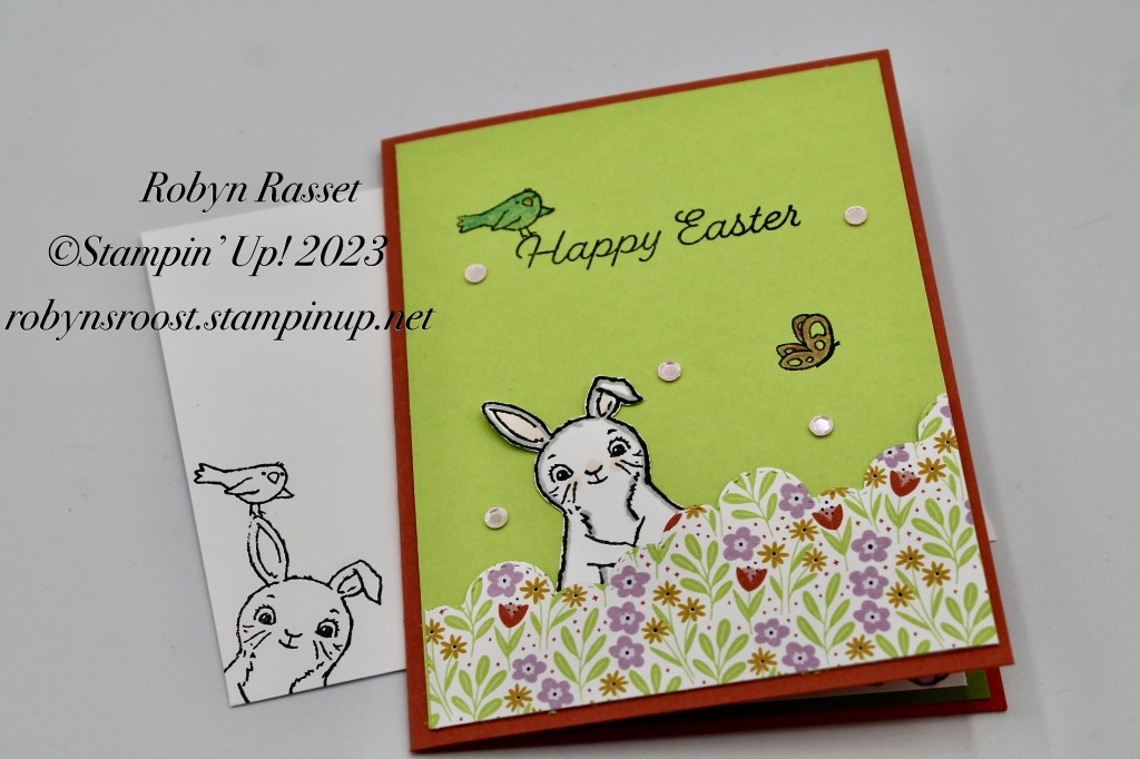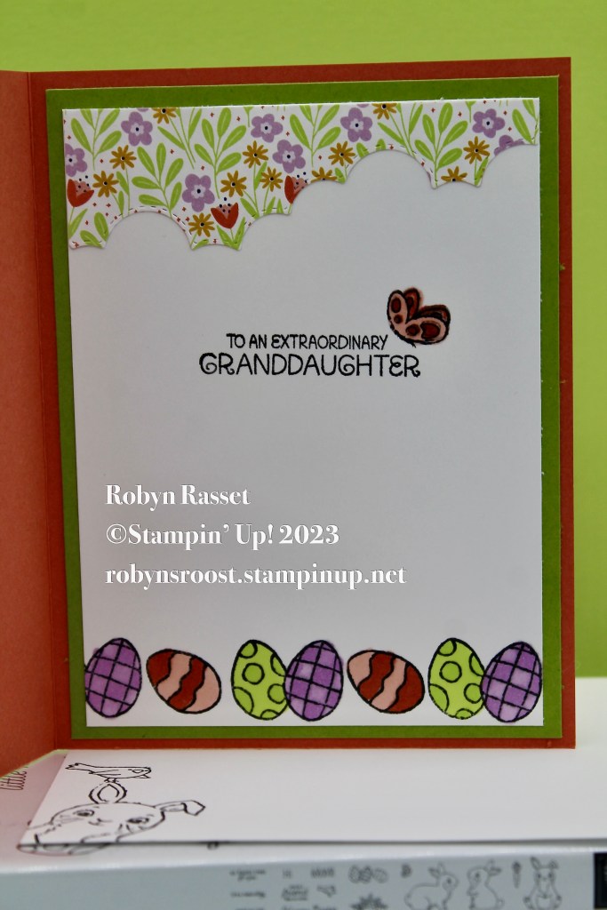 The inside of the card uses the other half of the die cut Butterfly Kisses paper and a greeting from the A Grand Kid stamp set. The eggs are colored in a variety of Stampin’ Blend colors. Remember, if you ever have any questions about something on the cards shown here feel free to email me. I can’t promise that I will remember how or why I did something but I will sure try to answer your questions.