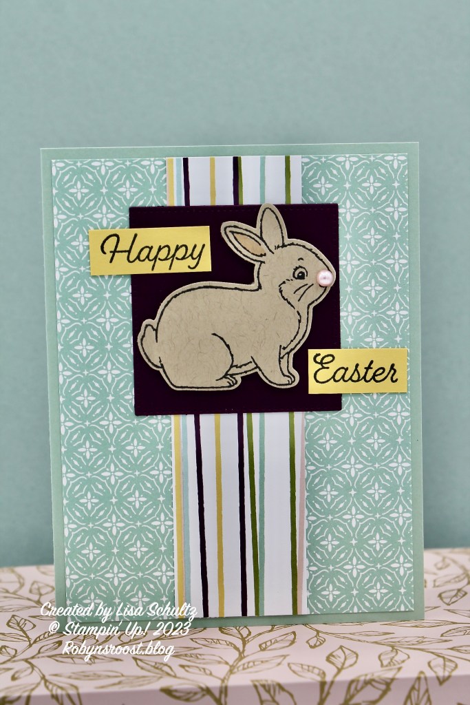 Lisa stamped her bunny on Crumb Cake cardstock, colored the one ear in pink and added a pearl for his nose. The pretty paper is from the Design a Daydream Hostess pack.