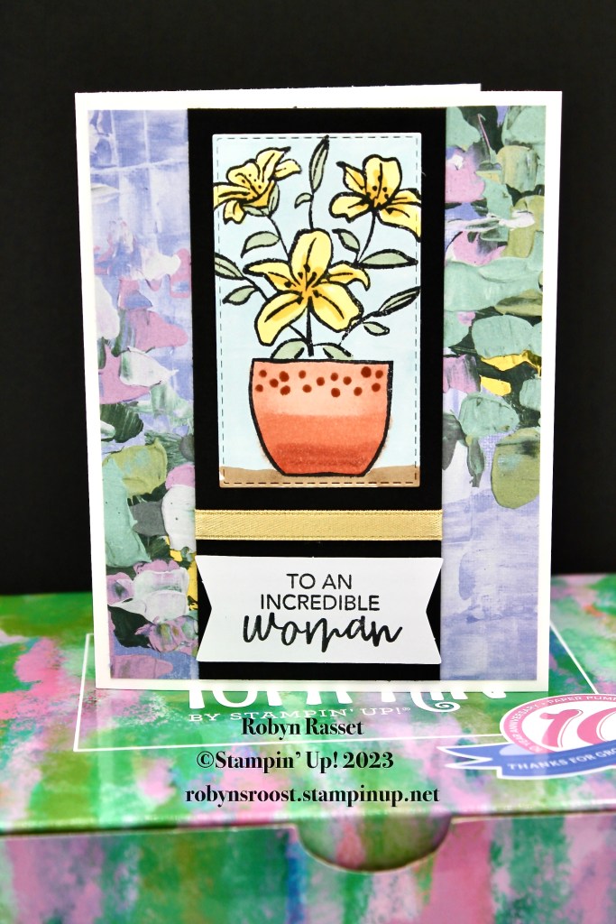 This is one of my favorites! I added a 4″ x 5 1/4″ piece of the Fancy Flora Designer Paper, a 2″ x 5 1/4″ piece of Basic Black and a Stitched Rectangle Die cut of Basic White. The flower has been colored with Stampin’ Blend Markers and a small piece of Gold Shimmer Ribbon is glued flat, without any knot or bow.