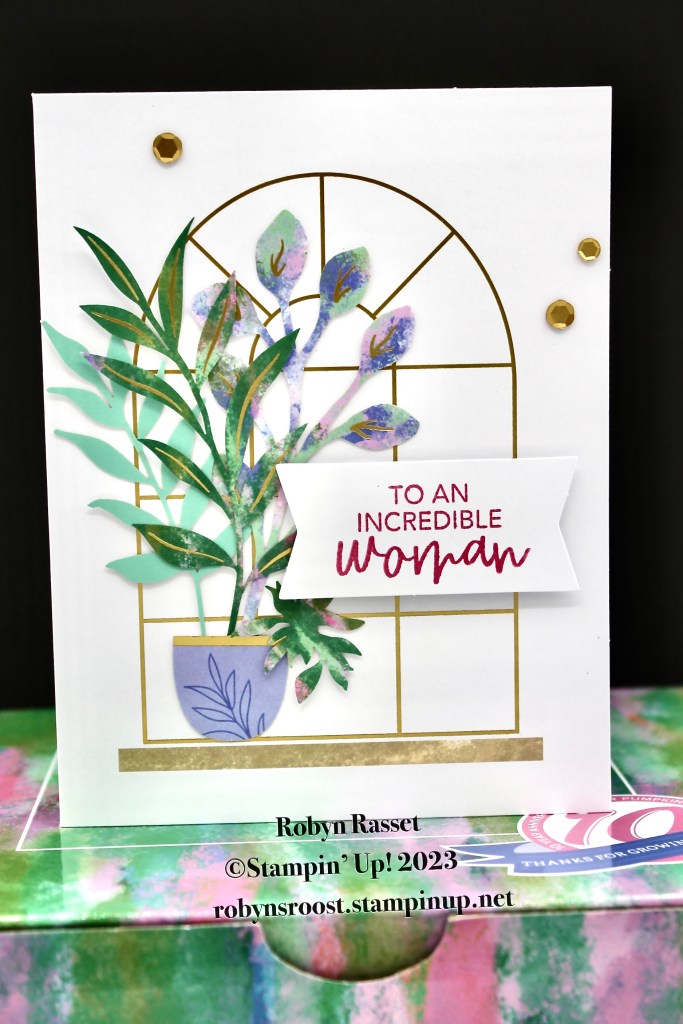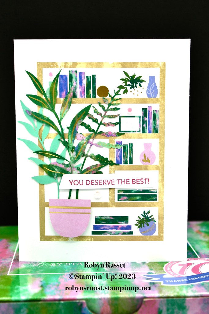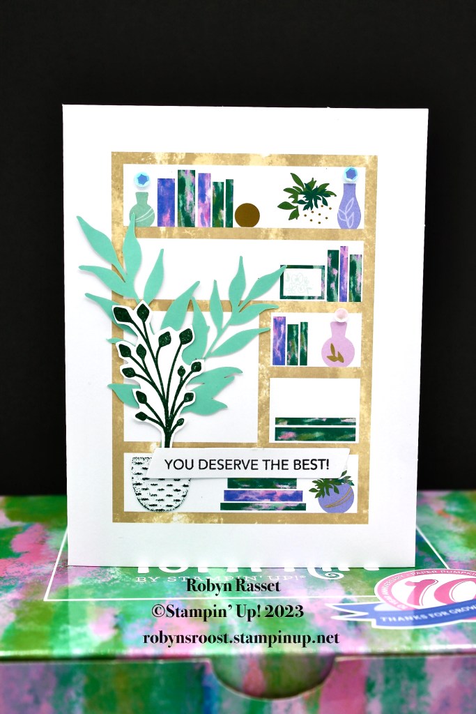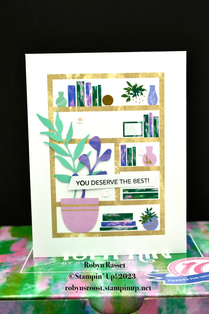 The kit has 3 different designs of card bases and I love this shelf one! I really didn’t change much on these from the original instructions. The flower pot is from the kit but has had a Shaded Spruce ink spot dragged across it to add a bit of color. The flower stem in the foreground was stamped on Basic White with Shaded Spruce ink and then fussy cut. Three Adhesive Backed Sequins added above the vases on the shelves.