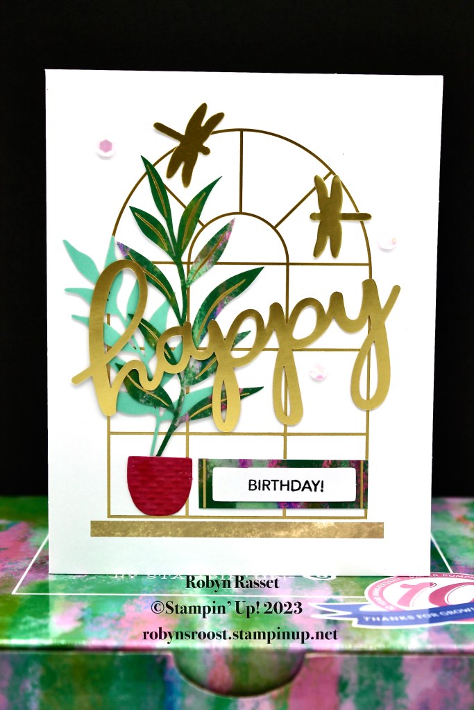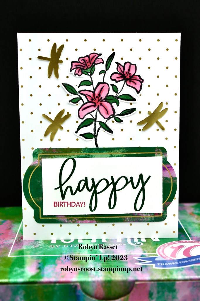 There was so much extra gold foil left after punching out the ‘happy’ die cuts that I just had to find a punch that was small enough to use some of the scrap. The little dragonflies from the Dragonfly Punch fit great, I think I ended up getting 5 of them. In addition I used some Basic White cardstock for the greeting and the flower (which was fussy cut after stamping with Tuxedo Black ink and coloring with Stampin’ Blend Markers). The large green die cut label has actually been shortened and then glued back together to layer under the greeting. I used the small strip that was cut out as a matte layer on another card. Don’t waste anything!