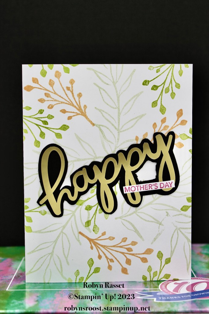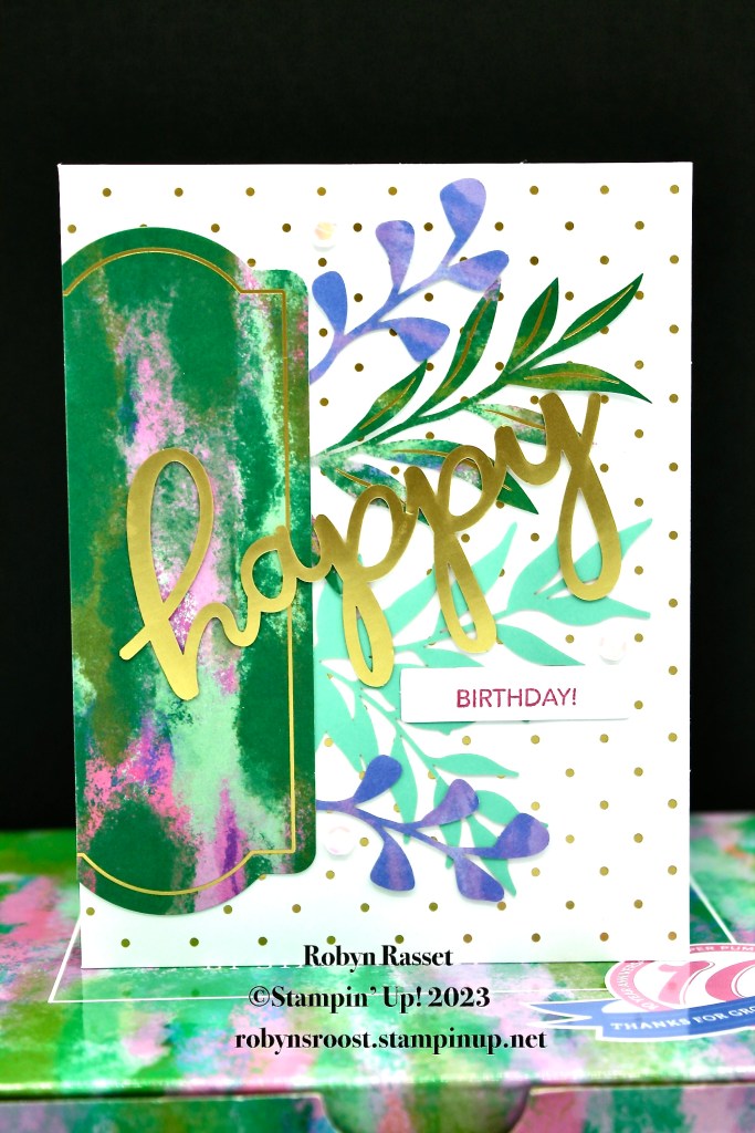 This last card has a Basic White card bae stamped with the two different leaf stamps from the kit in three colors: Lemon Lime Twist, Soft Seafood, and Pale Papaya. The gold ‘happy’ die cut from the kit was adhered to a piece of Basic Black and then it was fussy cut to create a shadow.