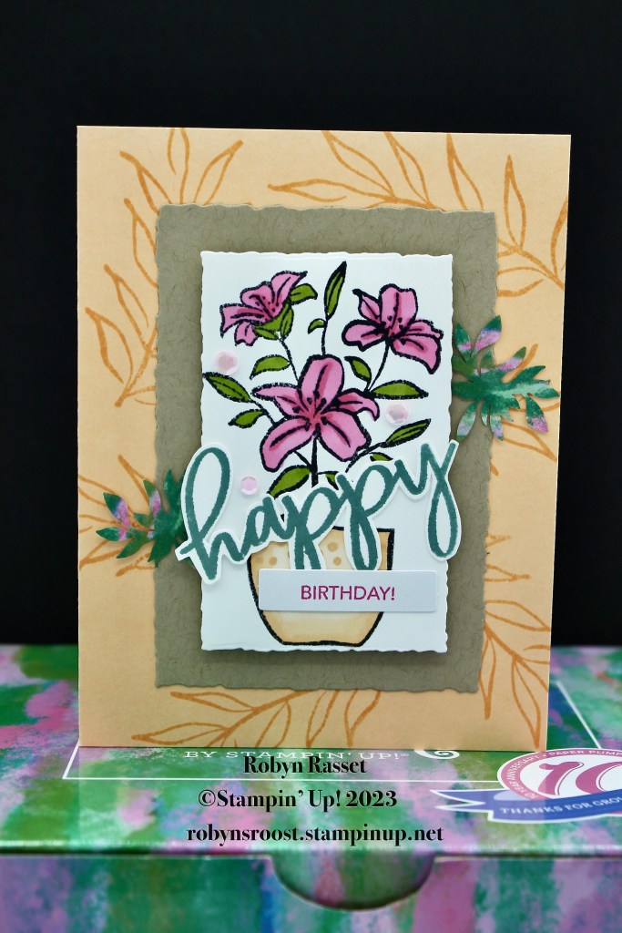This card uses a few more extra supplies.. The card base is a 1/2 sheet of Pale Papaya cardstock with two die cuts from the Deckled Rectangle Dies, one done with Crumb Cake cardstock and the other Basic White. The happy was stamped with Lost Lagoon ink on a piece of Basic White paper and then fussy cut. The leaves on the base were stamped with Pale Papaya ink. The flower is colored with Stampin’ Blend Markers. More of the Adhesive Backed Sequins were used on this card.
