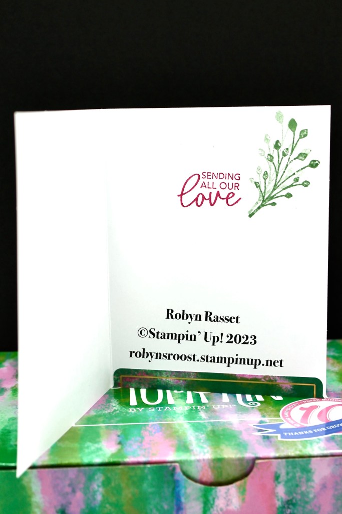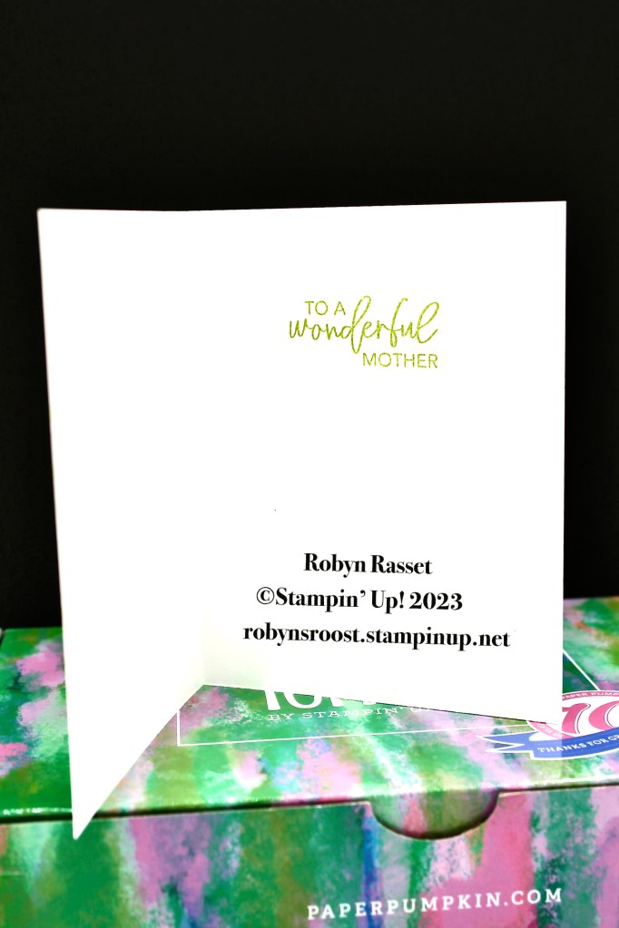 This card is another made exactly to the kit directions. I did a big boo-boo though on this card. I inked up the stamp with the Polished Pink ink when I had forgotten to clean it after using it in the black ink! I did not swear!! Really! But I did use several scrap pieces of paper to ‘sort of’ remove the black ink from the Polished Pink pad. I’ve only done this twice in 10 years and both times it was on a pink ink pad, lol.
