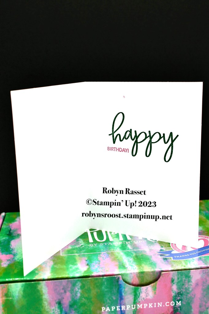 Here’s another one done to the kit directions with some Adhesive Backed Sequins added. That’s one of the great things about the Paper Pumpkin Kits, they can be completed exactly to the directions or if you don’t care for the card design, change it up!