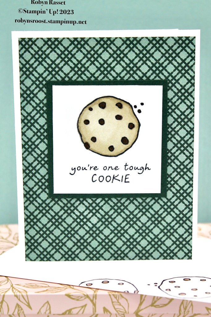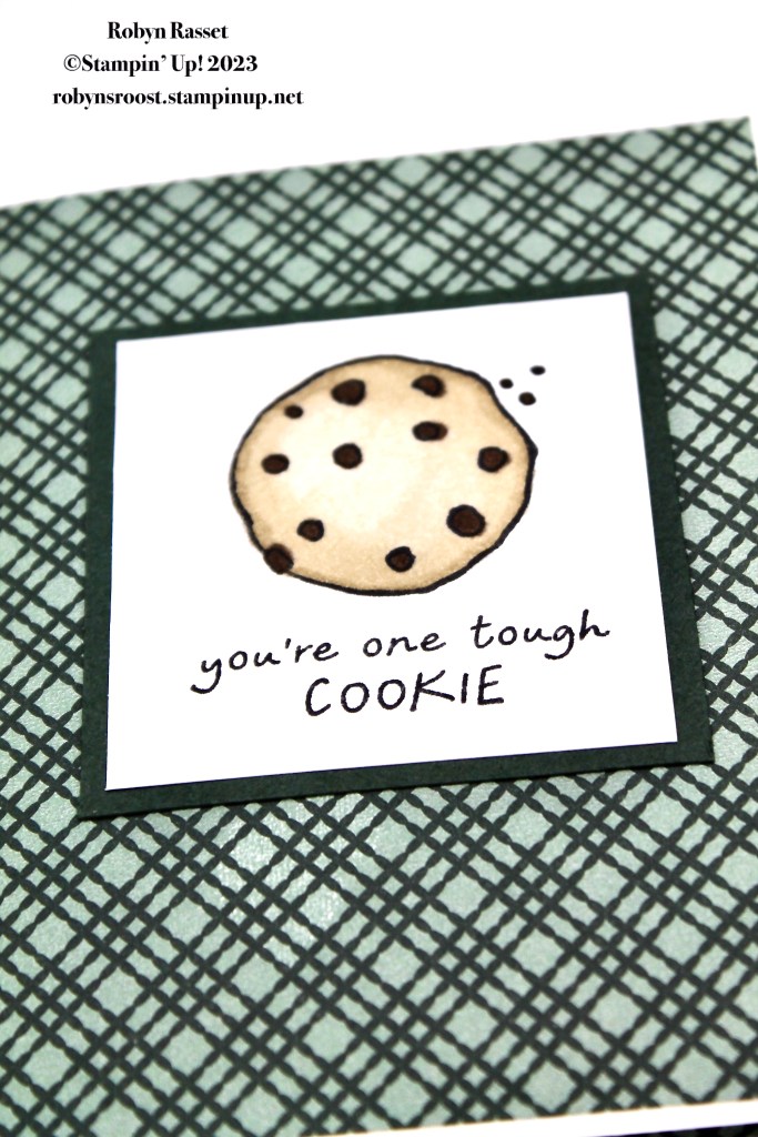 My next card features the Chocolate Chip Cookie image and matching greeting and is layered onto a 2 3/4″ square of Evening Evergreen. This card has a 4″ x 5 1/4″ layer of Lovely in Linen Designer Series Paper covering the cover.