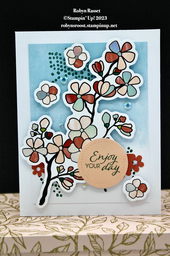 I actually liked the pink background with this design the best. I added the little single flowers off to the side though, because I thought they got lost on top of the large flower sprig and they are too pretty to just blend in.