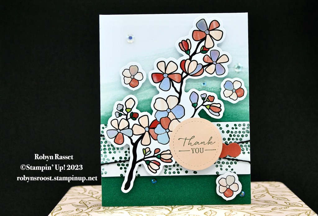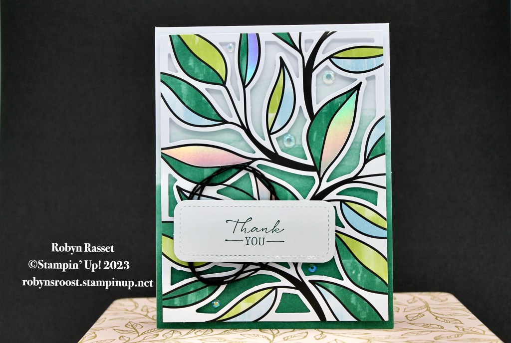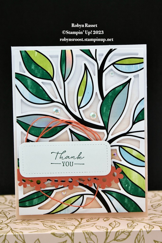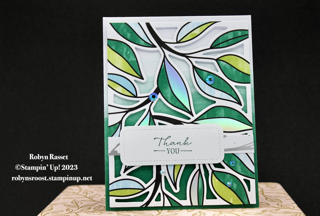I needed some thank you cards for customer who placed orders during the free shipping sale, so I pulled out a thank you greeting from the Grassy Grove stamp set. Other than the greeting this card is made to the directions. I fell in love with the foiled floral layer! The photo just doesn’t capture it’s glory.