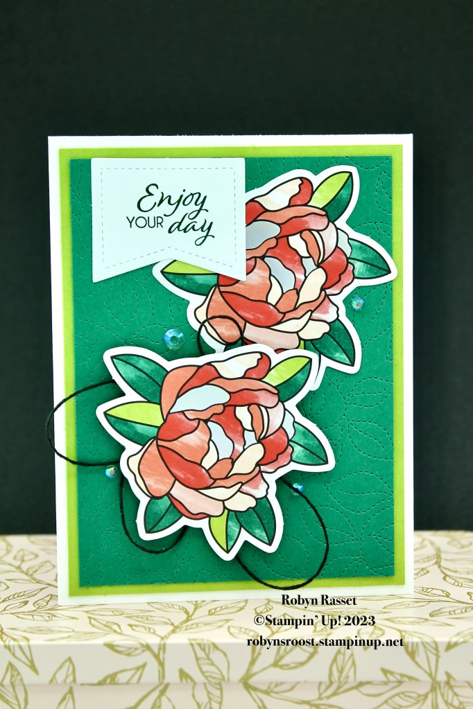 This card used the other two unused flowers. I added in a 4″ x 5 1/4″ piece of Granny Apple Green cardstock and a 3 3/4″ x 5″ piece of Shaded Spruce which has been die cut with the Stitched Greenery Die. The white card base was also an addition from the supplies in the kit.