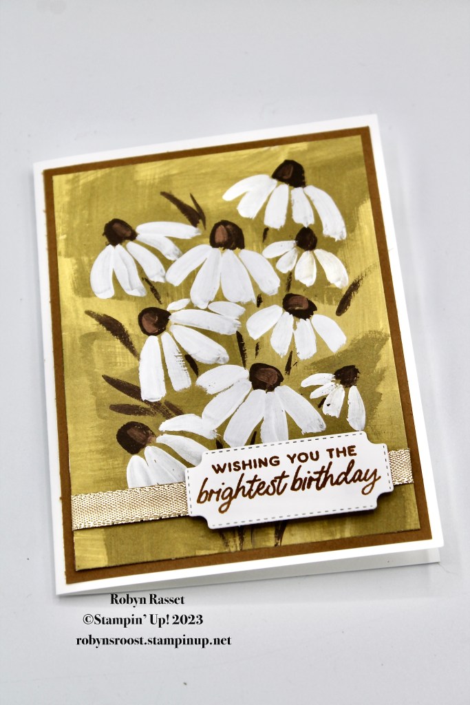 A piece of Gold Shimmer ribbon was wrapped around the Fresh As A Daisy layer and then adhered to a 5 1/4″ x 4″ piece of Pecan Pie cardstock. The card base is Whisper White Thick that is 8 1/2″ x 5 1/2″ scored at 4 1/4″.