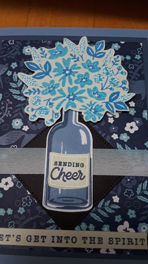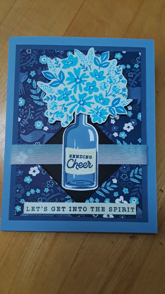 The images and greetings are from the Bottled Happiness set and the Vintage Bottle Punch was used to cut out the bottle. The bottle was stamped with Misty Moonlight and Boho Blue ink. While for the flowers, Azure Afternoon and Tahitian Tide were used on Basic White paper. After fussy cutting the flowers the white was just too white, so the background was colored in with a light Sea Foam Stampin’ Blend Marker. To pull a bit more Sea Foam onto the card, the little label was stamped with Sea Foam and a Misty Moonlight greeting was added. The black square was die cut with the Stylish Shapes Dies and the greeting on the bottom was stamped on Basic White paper with Misty Moonlight ink and the Soft Sea Foam ink was added with a Blending Brush. The pretty variegated ribbon is Balmy Blue and White.