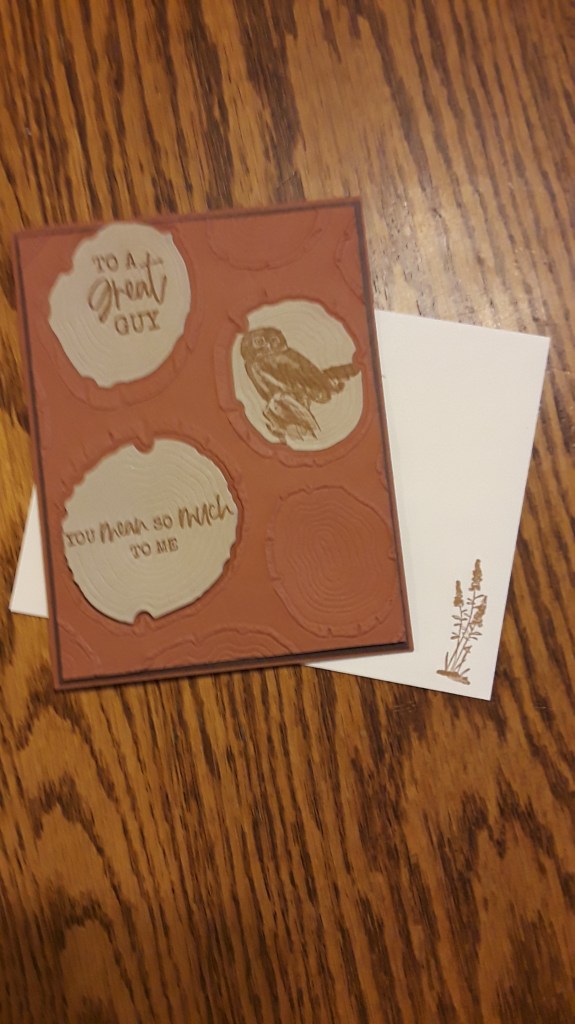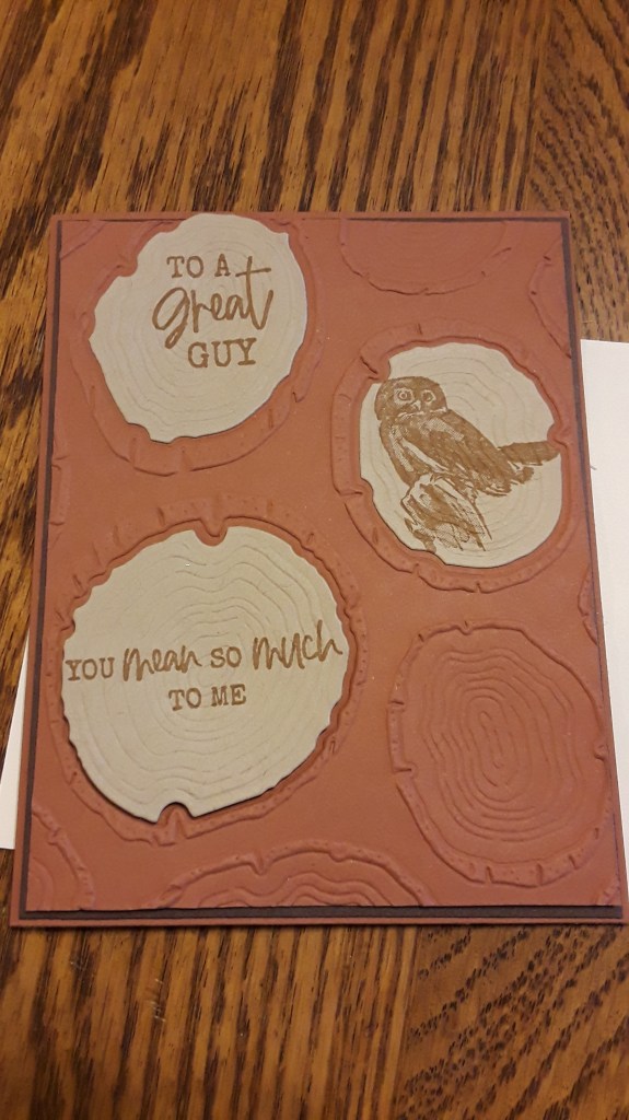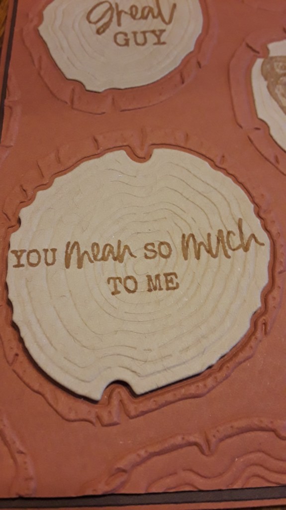 The color ccombo used here is Copper Clay, Early Espresso, Pecan Pie, and Crumb Cake. The Tree Rings Hybrid Embossing Folder/die #159888 was used to create the tree ring background and die cut the image and greetings.