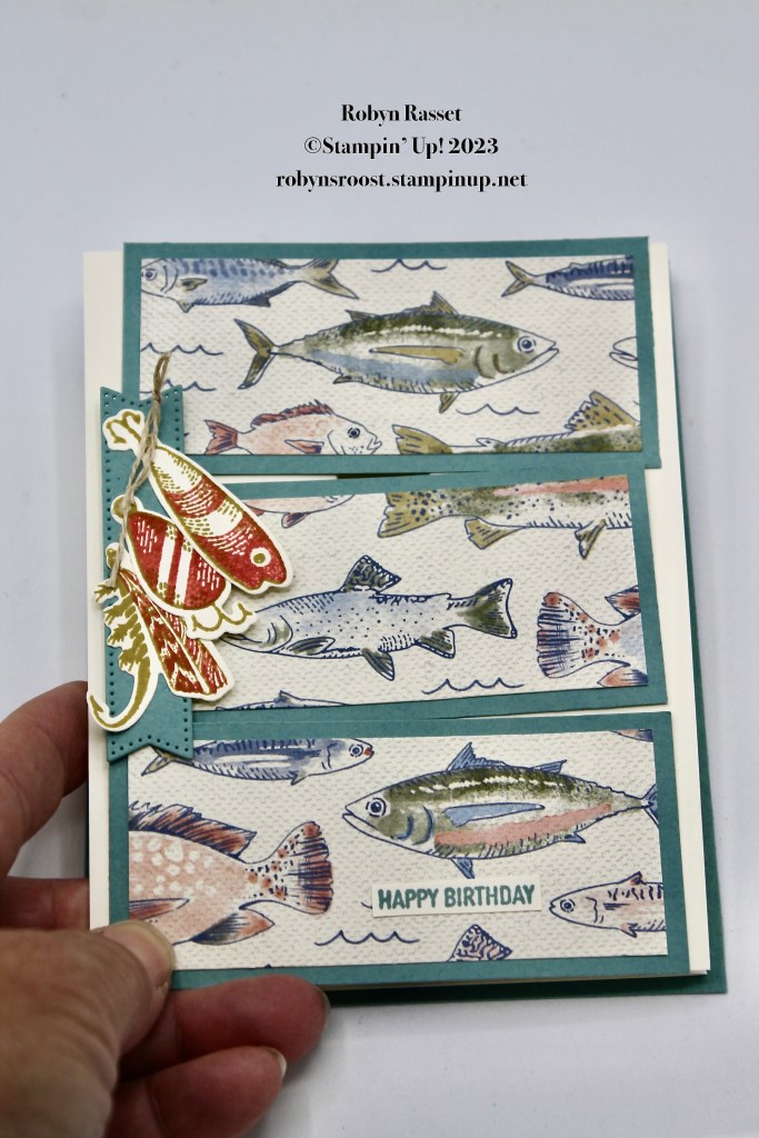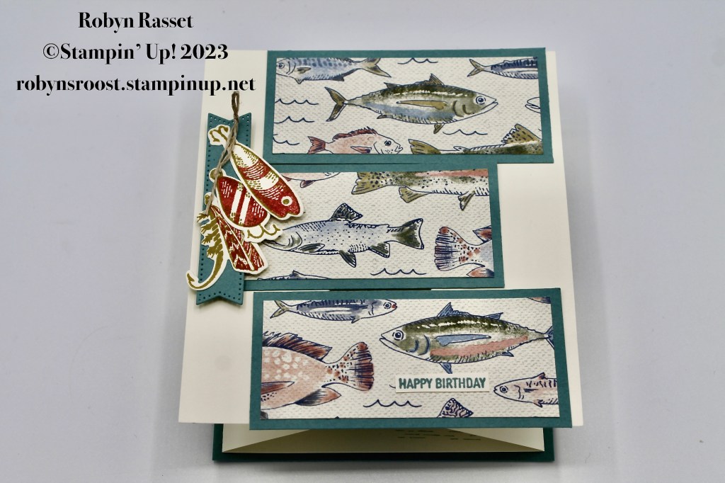 This fun fold card was inspired by Cindy Brumbaugh and uses the Gone Fishing Bundle.