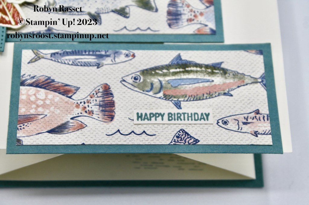 There are 3 sets of fish from the Let’s Go Fishing Designer Series Paper that are 3 1/2″ x 1 1/2″ and are adhered onto Lost Lagoon layers that are 3 3/4″ x 1 3/4″.