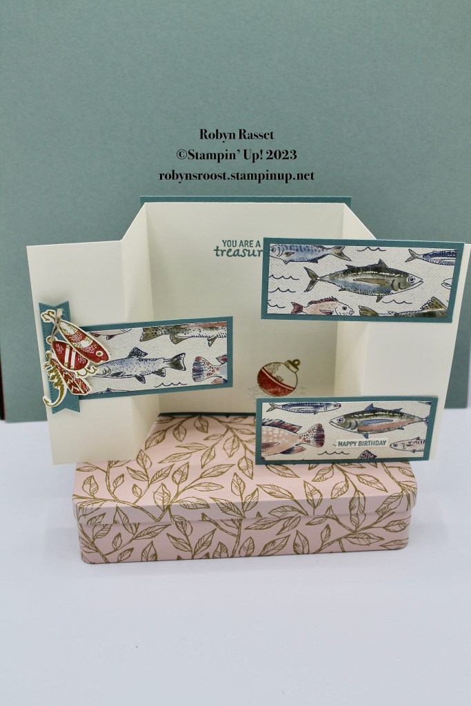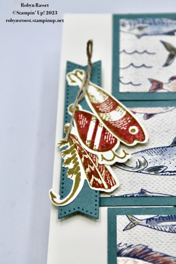 A die cut banner from the Stylish Shapes Dies holds 3 die cut fishing lures. The banner is adhered to just the center fish and helps to hold the other fish flaps closed. The lures are stamped with Wild Wheat and Calypso Coral. The Wild Wheat is a nice gold color. A piece of Linen Thread is adhered to the dies to make them look like they are tied together.