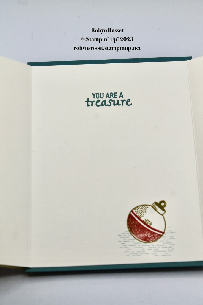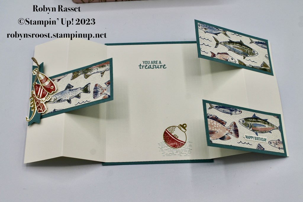 Some little greetings are pulled in from the On the Ocean stamp set. The Happy Birthday on the bottom right front, and the You Are A Treasure on the inside. The inside bobber is done in the same Wild Wheat and Calypso Coral colors as the lures on the front. A mask was cut from a post-it-note before stamping the water, which is done with Lost Lagoon ink and was stamped off first before stamping on the card.