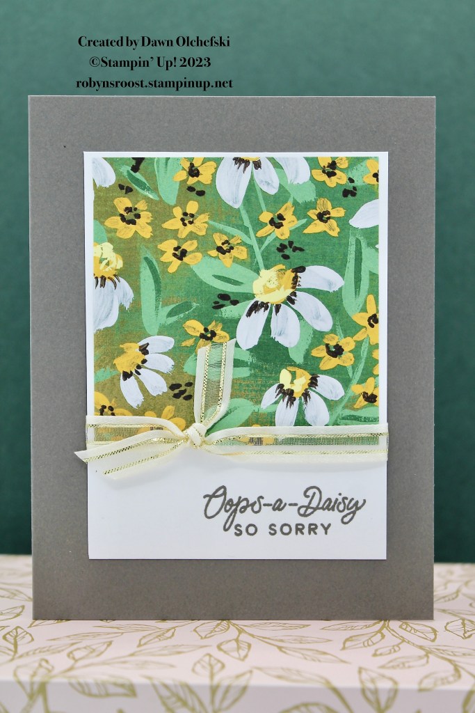 This card is a great example of simple and classic stamping. The base is the new Pebbled Path color and the greeting is stamped in the same color. The Basic White layer is 3 1/4″ x 4 1/4″ and has a 3″ square of the pretty Fresh as a Daisy Designer Series Paper for a bright pop of color. The pretty Gold & Vanilla ribbon adds a bit of sparkle.