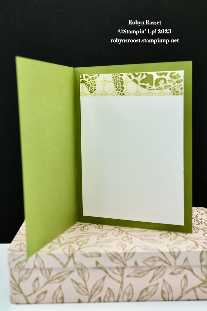 Again, a piece of the scrap from the DSP is added to the inside. This is a great technique for using a patterned paper that maybe wasn’t one of your favorites. Look for a pattern that is more on the subtle side, one without bold patterns. Choose an ink color that coordinates with the colors in the paper.