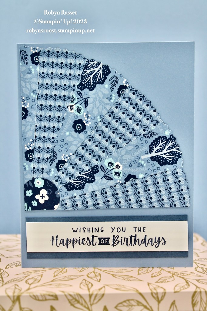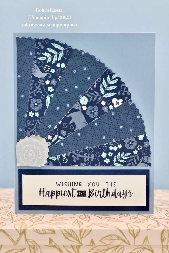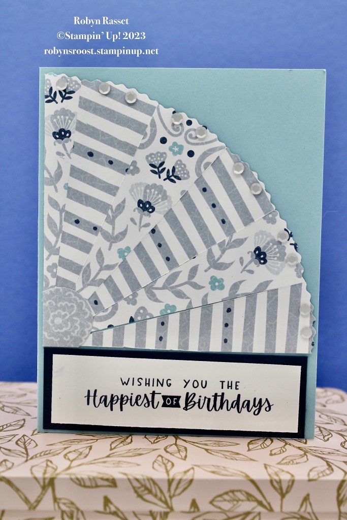 For this card some Neutrals Adhesive Backed Sequins were added along the edge of the fan for some sparkle. It uses Balmy Blue and Night of Navy cardstock.