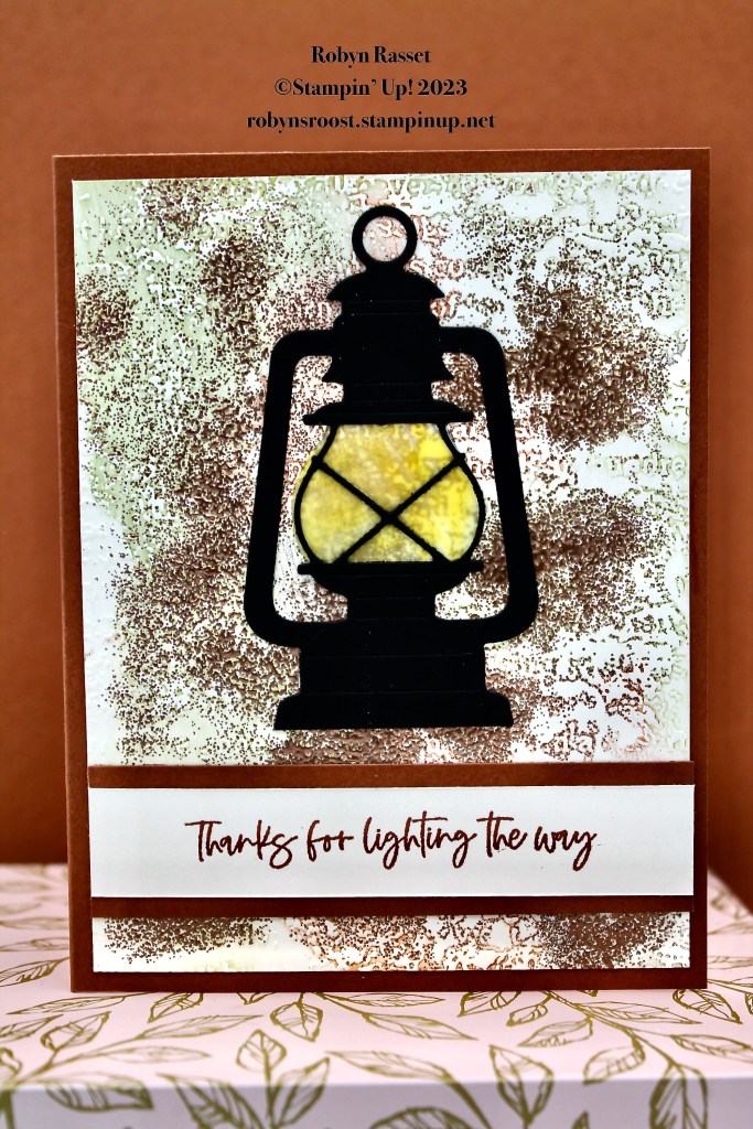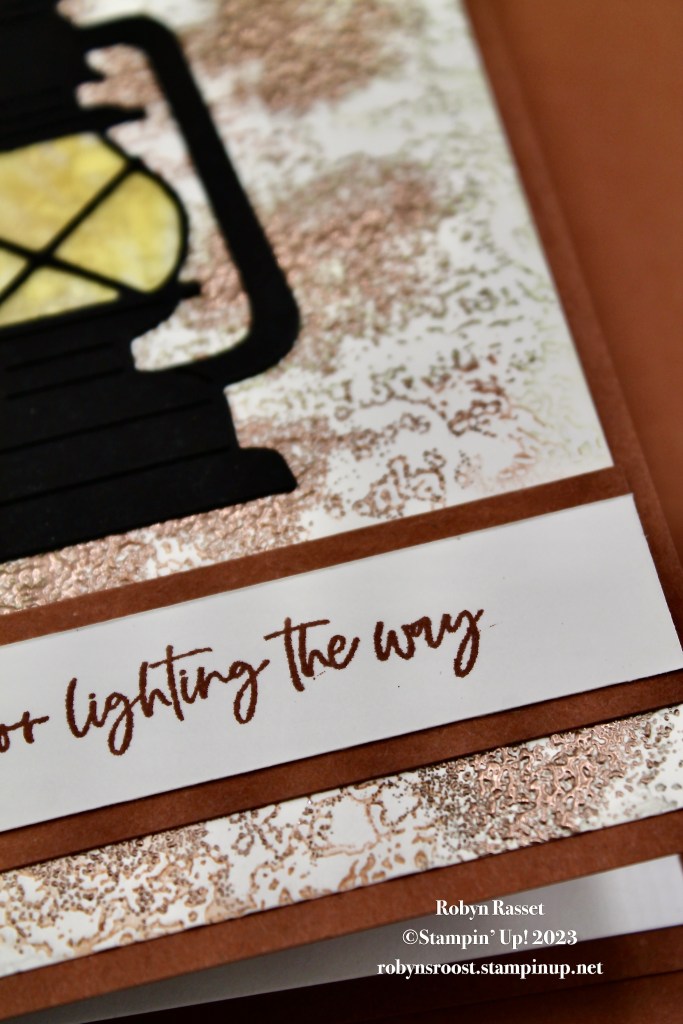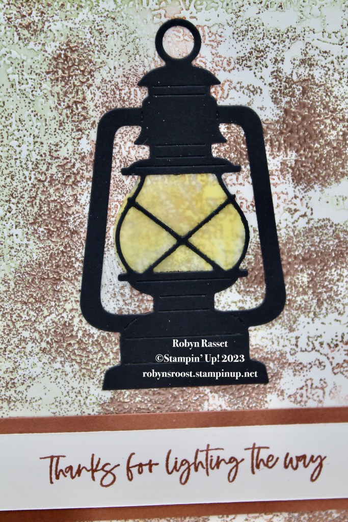 The lantern from the Lighting the Way Die set was cut from Basic Black cardstock and a small piece of vellum was fussy cut to fit to create the lantern glass. It was colored with a Daffodil Delight Stampin’ Write Marker and adhered with liquid glue to the backside of the lantern to give it a nice glow.
