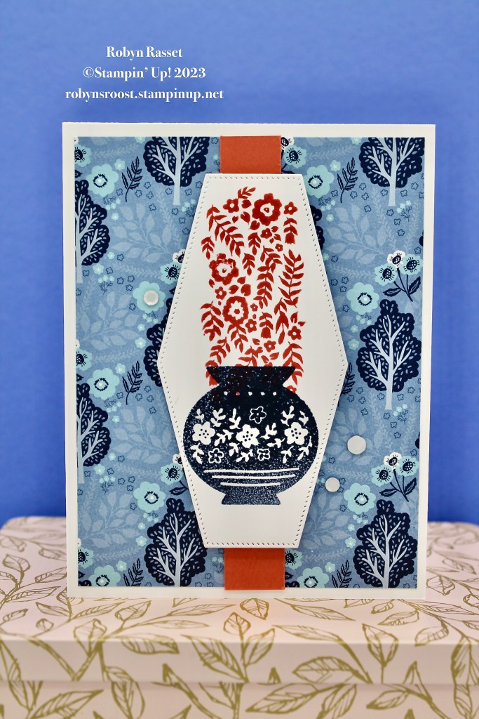 This alternative design only uses the stamps from the kit. A Basic White Thick card base, 4″ x 5 1/4″ piece of Country Inn DSP, 1″ x 5 1/4″ piece of Calypso Coral card stock and a Basic White Die cut from the Nested Essentials Dies. The Night of Navy ink is from the kit and an additional Calypso Coral ink was used. Some Neutral Adhesive Backed Sequins were added as well.