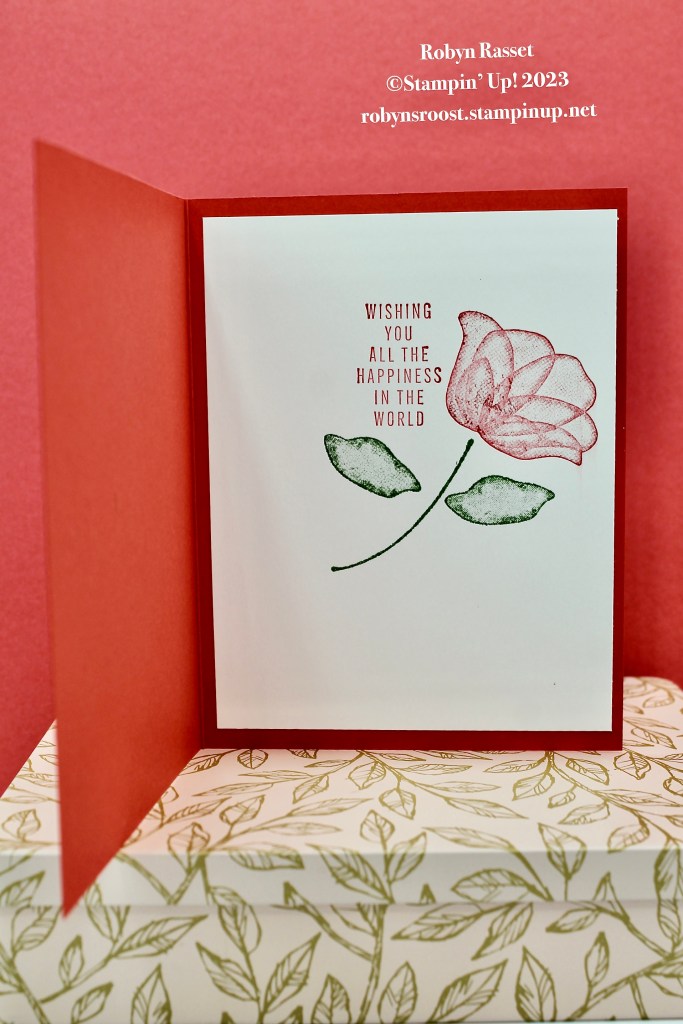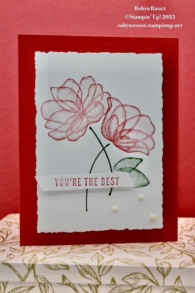 This pretty floral set does have a die set as well, which you will see used on the card below. The online presentation offered two Make and Takes, for each of the tree card designs. The first was a simple version and the second was a stepped up version. This card uses the Deckled Rectangle Dies to cut out the white layer. Vanilla colored Basic Matte Dots adorn the bottom right. Ink colors are Poppy Parade and Garden Green. I like that even though I didn’t get the stems perfectly aligned with the blossoms the image is still nice.