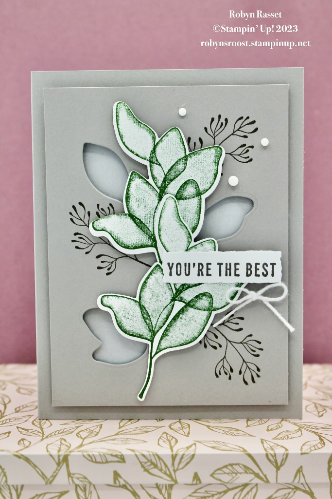 I’ll admit that I wouldn’t have chosen gray for a congratulations card but this design is pretty. Two of the pretty leaf sprigs are stamped in Garden Green and die cut, then layered onto the card base. Three twigs are stamped in Granite Gray directly onto the base. The leaves are popped up with dimensionals and the greeting has one dimension on top of the leaves and a stack of two dimensionals where it is adhered directly to the card base.