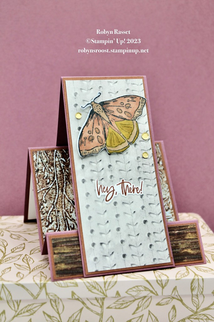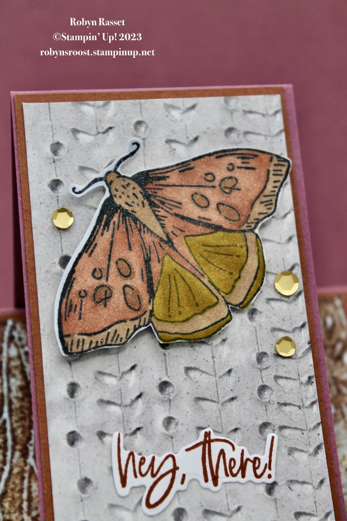 This moth is colored with Copper Clay, Wild Wheat , and Bronze colors of Stampin’ Blend Markers. As a final touch Wink of Stella is brushed over the entire moth.