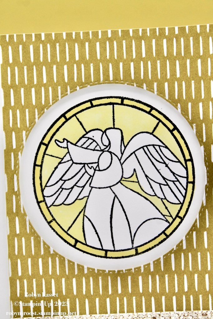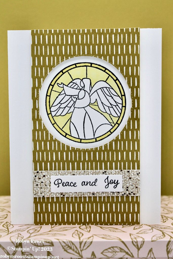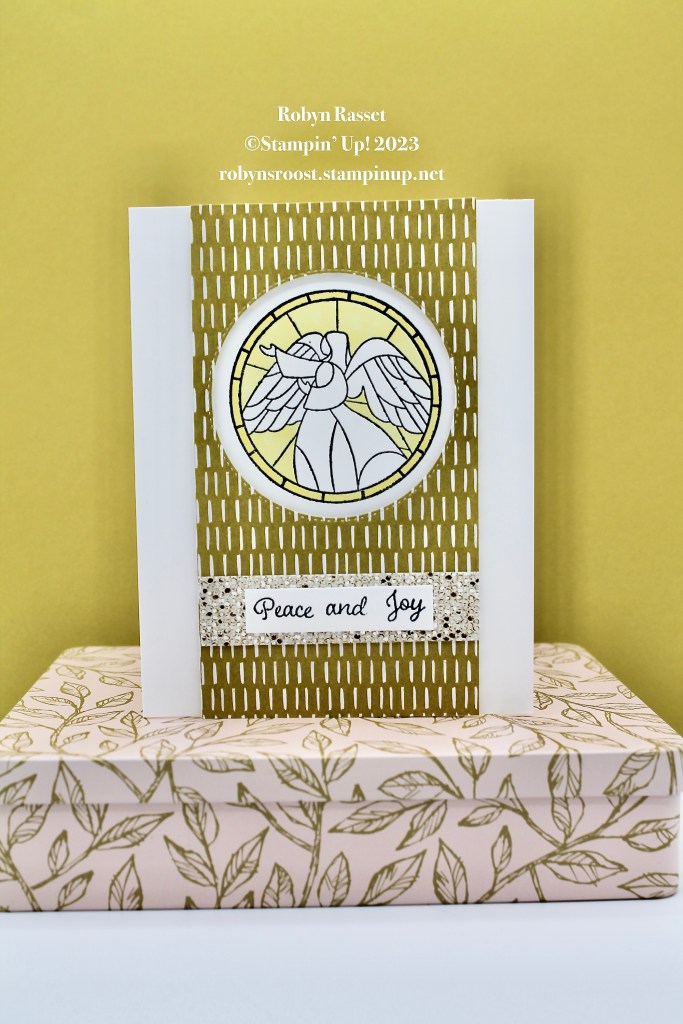 I chose the stained glass angel for this card and combined it with a piece of the Wild Wheat 2023-2025 In-Color Designer paper cut to 3″ x 5 1/2″. The DSP layer is popped up with dimensionals.