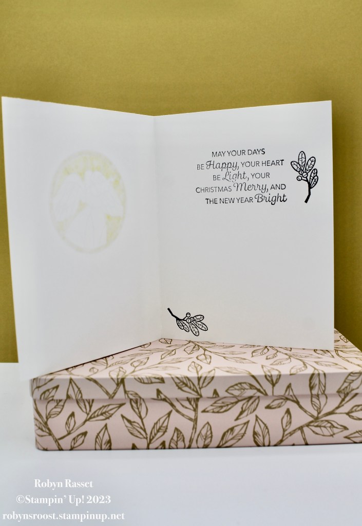There isn’t an inside greeting that works well with the angel so I pull in a greeting from the Very Best Occasions stamp set. I thought about using the circle cut out from the front DSP to cover the bleed through from the front but I really like the way that the angel glows when the card is standing and the light shines through it so left it alone.