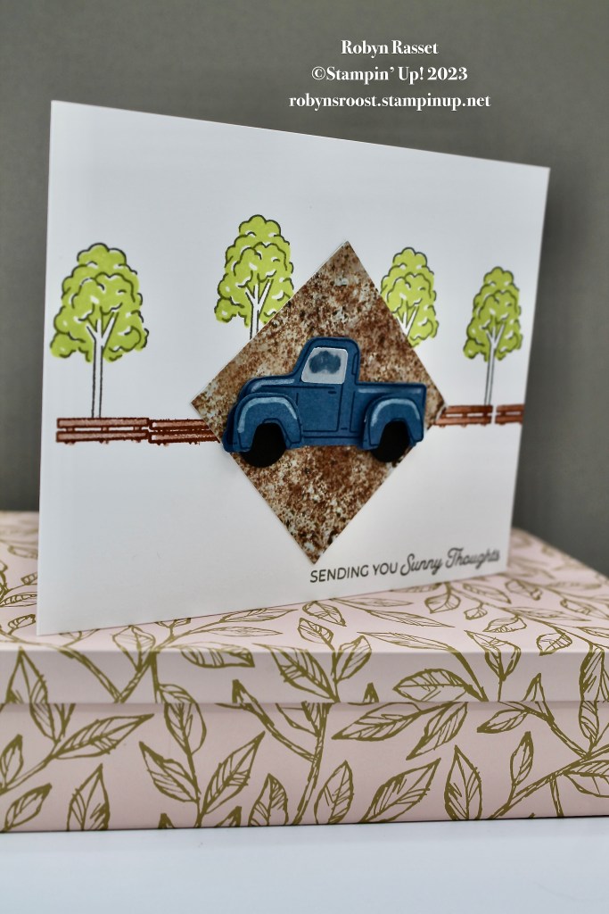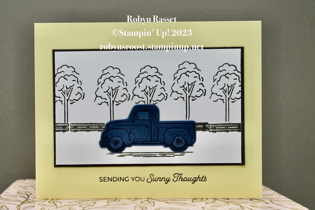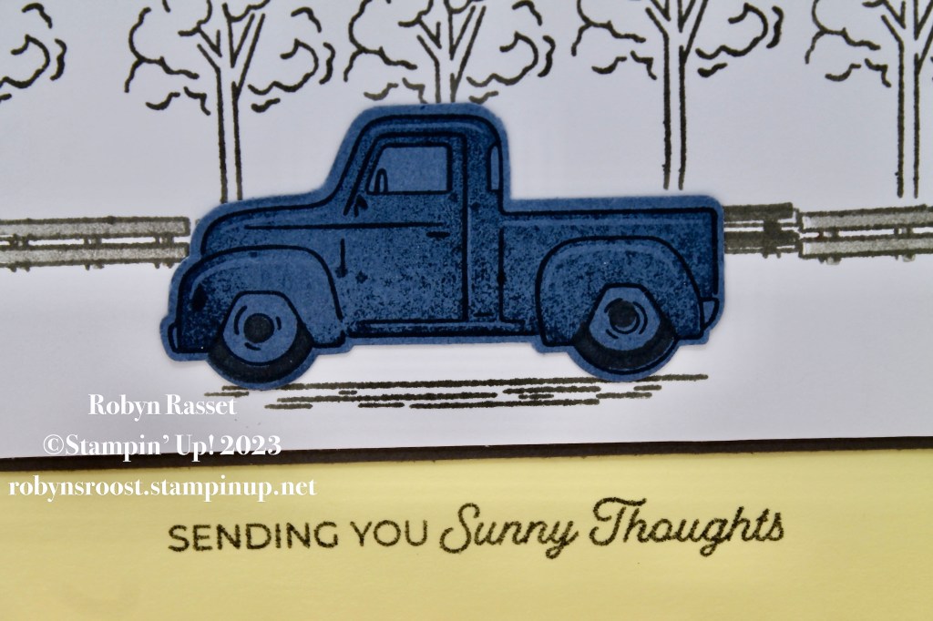 There are many two-step stamps in this set! The truck is stamped first in Pebbled Path with the outline stamp and then the the fill in stamp is inked with Misty Moonlight and stamped off first before stamping over the outline on the Misty Moonlight paper. The tires are stamped with Pebbled Path. Pebbled Path ink is used for all of the background images with the stamp for inside of the guard rails being stamped off before stamping inside of the outline. The greeting is also inked with the Pebbled Path color.