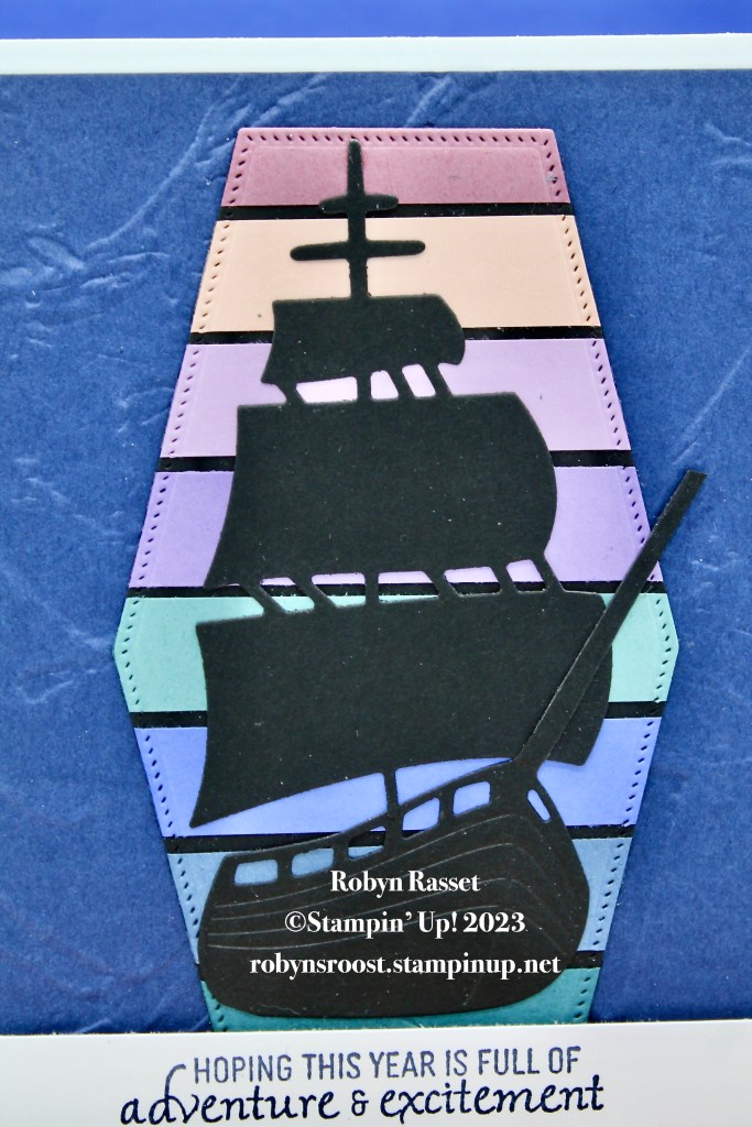 The ship is from the On the Ocean Dies and the greeting is from the matching On the Ocean stamp set and is inked with Night of Navy ink. The Night of Navy matte is embossed with the Painted Textures Embossing Folder. The only place that Stampin’ Dimensionals are used on this card is for the greeting strip which is 1/2″ x 4″.