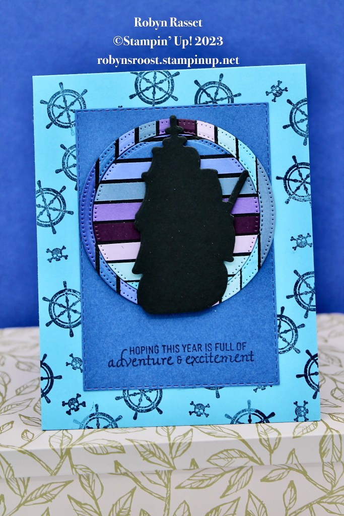 Here’s another card using the On the Ocean Bundle. This card uses 1/4″ strips and the circle is cut with two dies from the Stylish Shapes Die sets. I actually made a mistake when cutting the large circle and ended up with a flat spot on my circle. I decided to cut the circle smaller and then spun the larger frame circle so that the flat spot would be covered by the ship. I’m not as happy with this ship, it’s really meant to be stamped first, to capture the details, before die cutting.