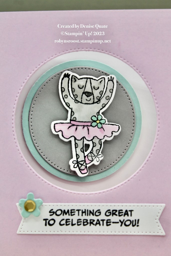 Denise used the circle dies from the Stylish Shapes Die set to to create a window in the card front and then double popped up the little ballerina on the inside of the card.