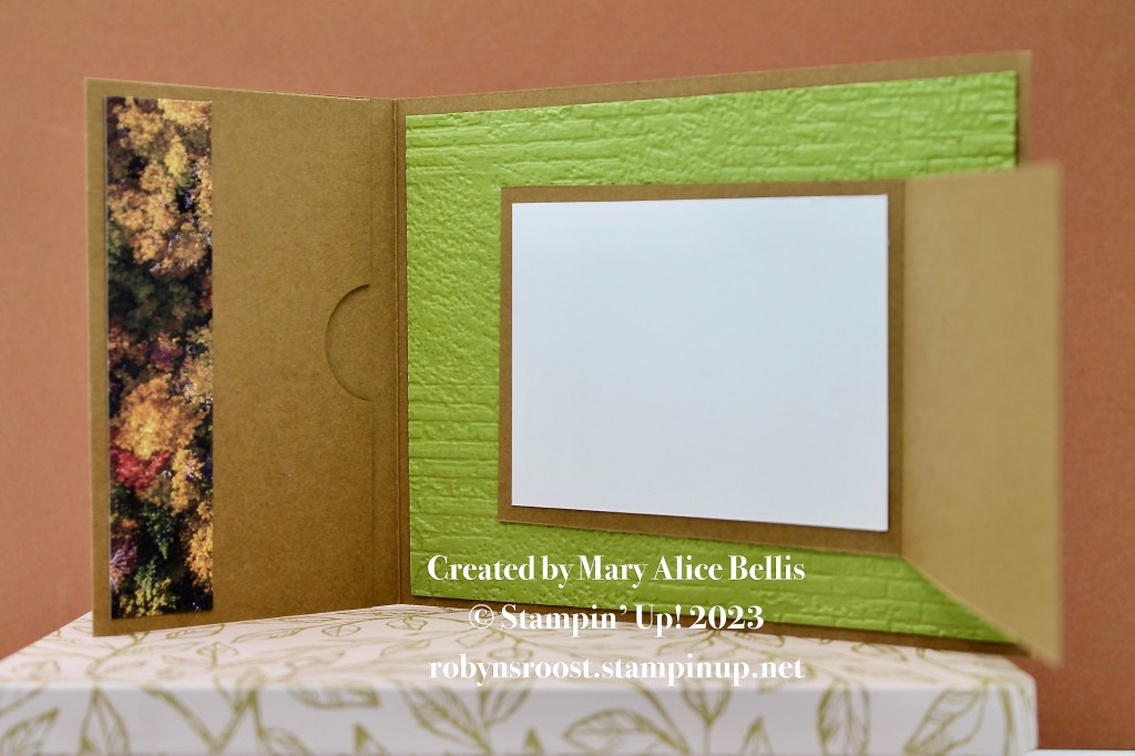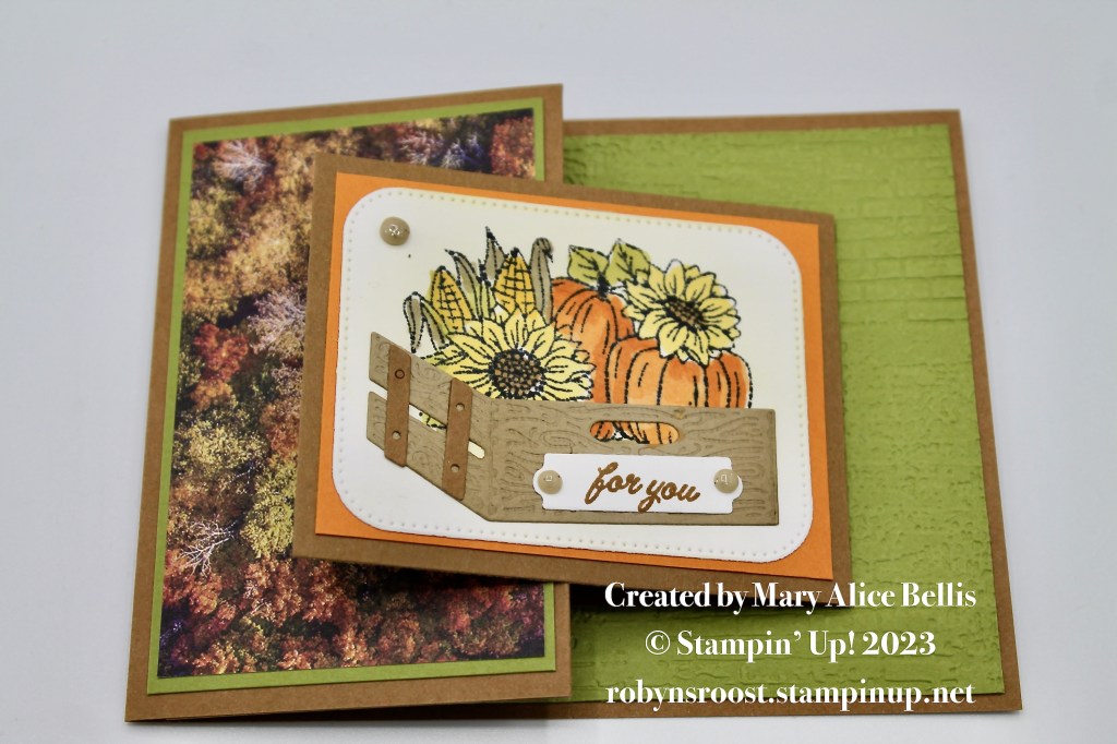 Mary Alice has created a fun gift card holder using the Rustic Crate Bundle. I love all the texture on this card. The All About Autumn Designer Series Paper really sets the fall mood. The Adhesive Backed Speckled Dots fit the theme perfectly too.