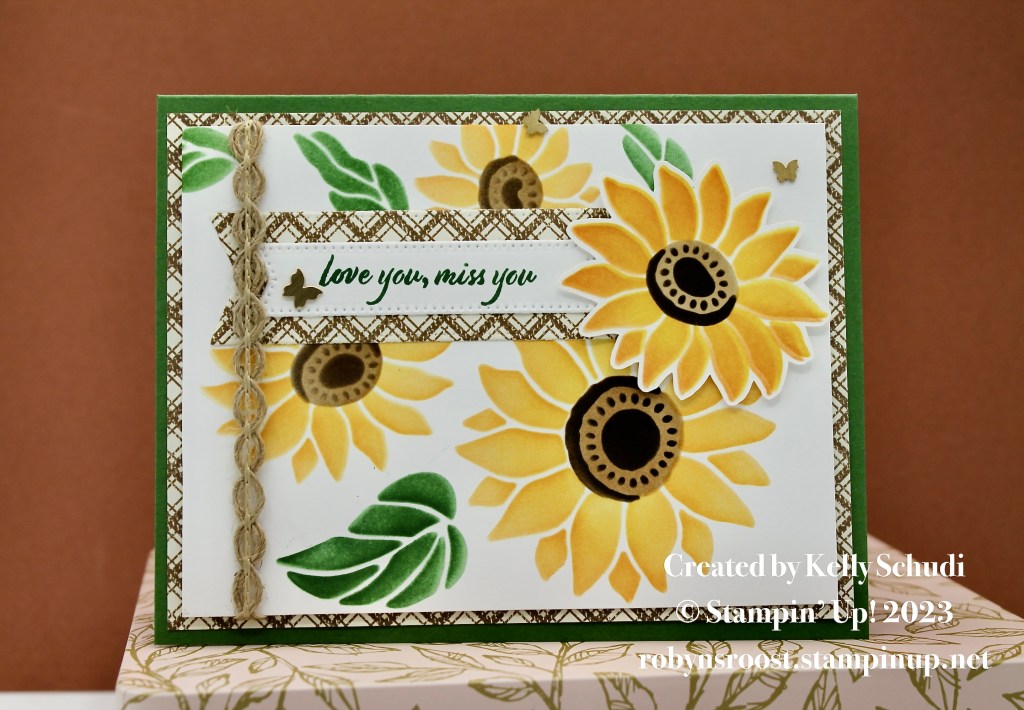 Kelly’s card features the Abundant Beauty Decorative Masks which can be found on page 47 of the Mini Catalog. The greeting is from the Very Best Greetings stamp set and is on a banner made using the Stylish Shapes Dies. The Natural Wavy Trim is great for a fall themed card. The little Brushed Brass Butterflies remind me of the Monarchs that are busy in the garden now.