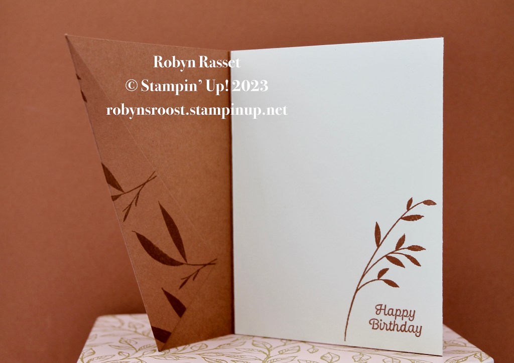 Here’s a view of the inside where you can see how the fold back works. The stem and greeting are stamped in Copper Clay which is the base color of the card. The greeting is from the Very Best Occasions stamp set, one of my go-to sets for greetings. I’ve cut the Very Vanilla liner the full size of the inside of the card 5 1/2″ x 4 1/4″. I like to use liquid glue to adhere a big piece like this so that I can wiggle it a bit to line it up.