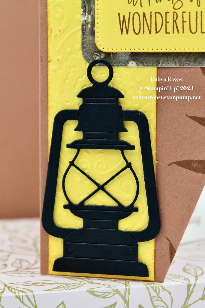 Isn’t this lantern die just AWESOME! It has all these cool score lines in it to add detail to the lantern. Behind the lantern is a 1 3/4″ x 5 1/2″ piece of Crushed Curry (a great fall color) that has been embossed with the Countryside Blossoms Embossing Folder and then the edges are sponged with some Crushed Curry ink to define them.