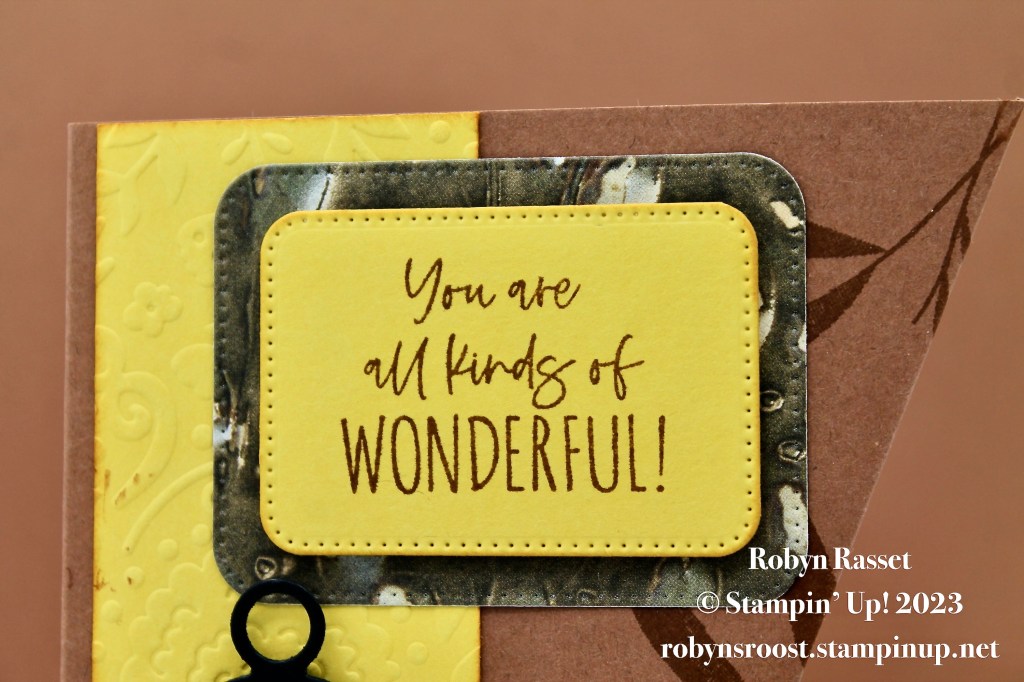 The greeting is stamped on a Crushed Curry layer which has been die cut with one of the Nested Essentials Dies and is popped up on another Nested Essentials die cut from the Earthen Elegance Designer Series Paper. The greeting layer edges are also sponged with Crushed Curry ink.