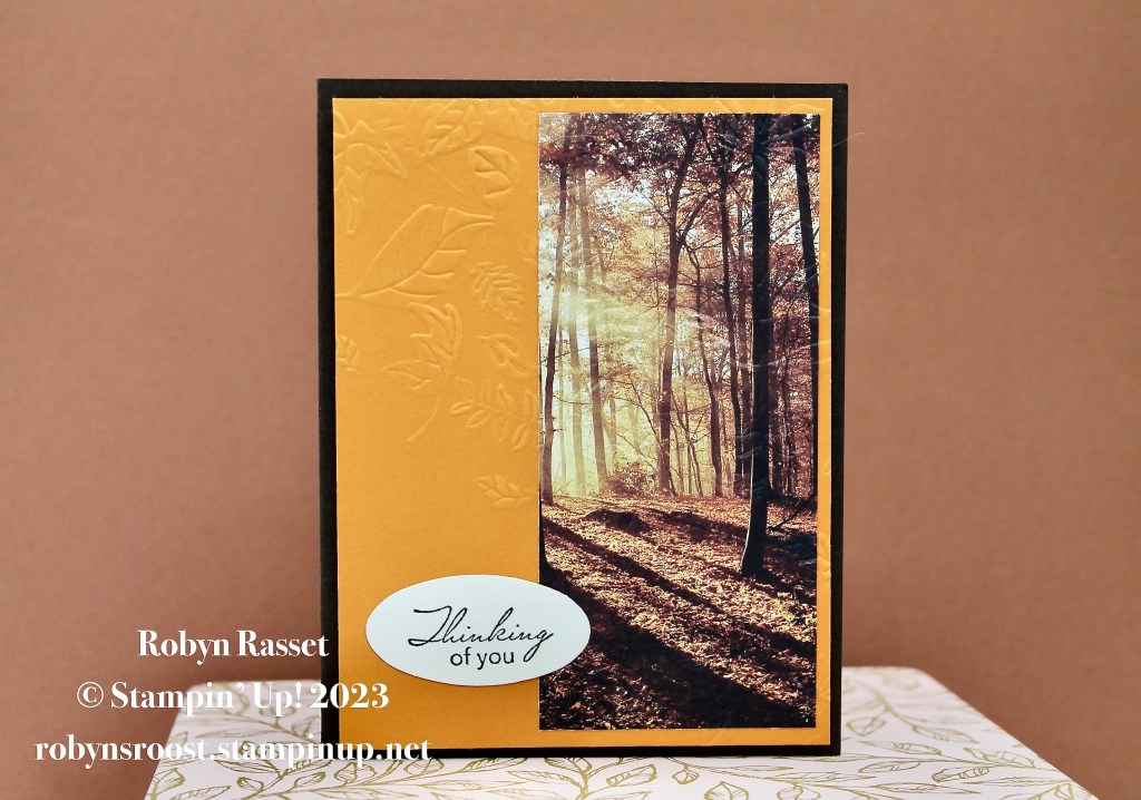 The gorgeous piece of All About Autumn DSP is adhered to the Pumpkin Pie layer, as well as the greeting, BEFORE running it through the Leaf Fall Embossing Folder. This gives the DSP some texture, as well as the background.