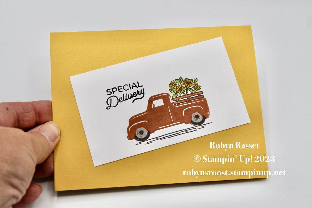 The Basic White layer is 2 1/2″ x 4 1/4″ and is layered onto an 8 1/2″ x 5 1/2″ Crushed Curry card base that is scored at 4 1/4″. There are multiple stamps to create all the details and layers on the truck, but they are easy to line up with the clear photopolymer stamps. The only items that weren’t colored with stamps were the leaves, flower centers and gray centers of the tires. Stampin’ Write Markers were used for these.
