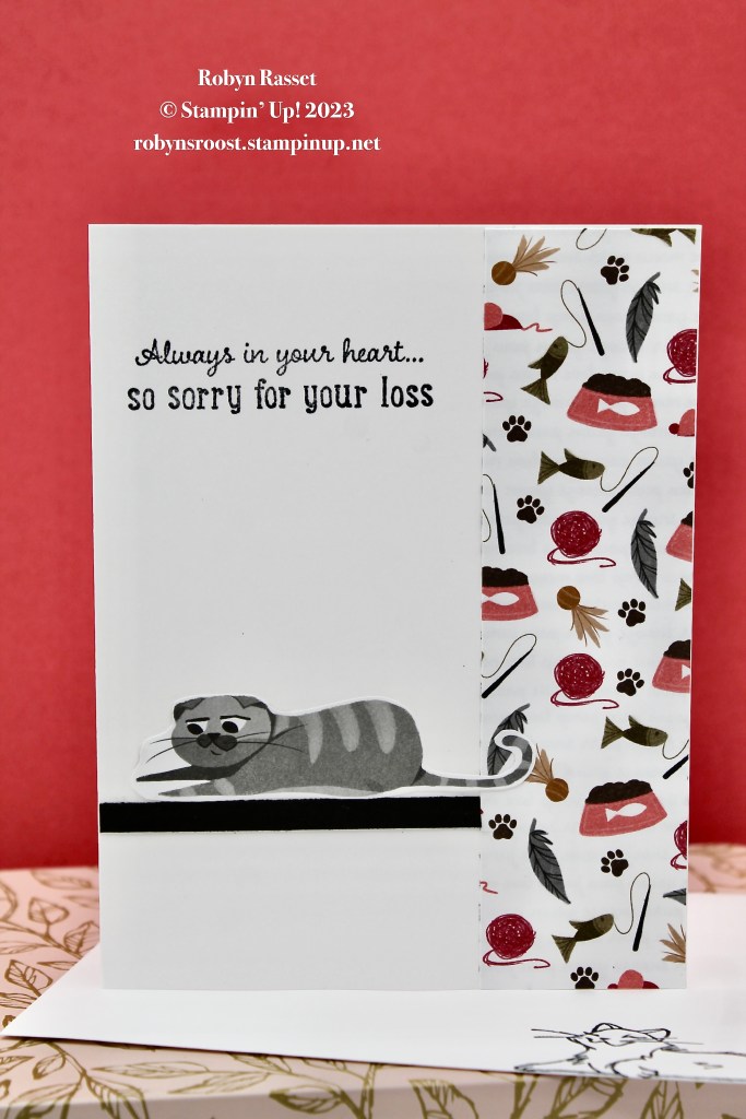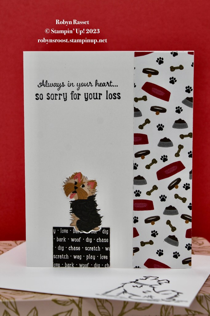 Today I have two cards created for friends who recently lost furry family members. If you are a pet lover like me, your pets are family. I didn’t have any current Stampin’ Up! sets with pet sympathy themes so I climbed up on my table, to reach the retired sets on the high shelf, lol, as I get older I’m going to have to rethink that high shelf thing.