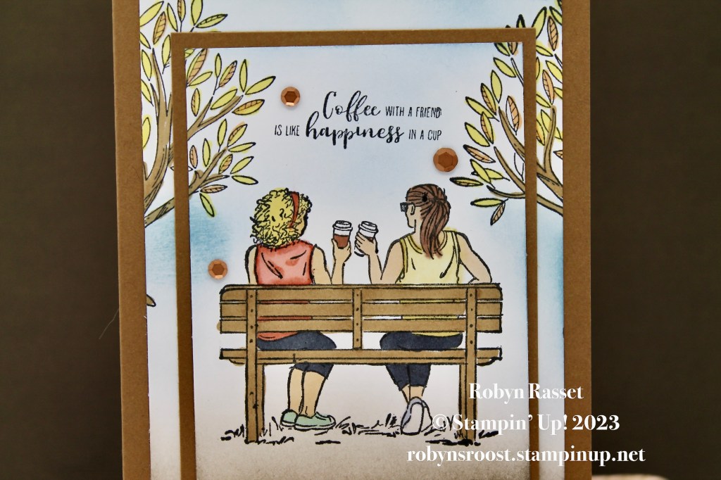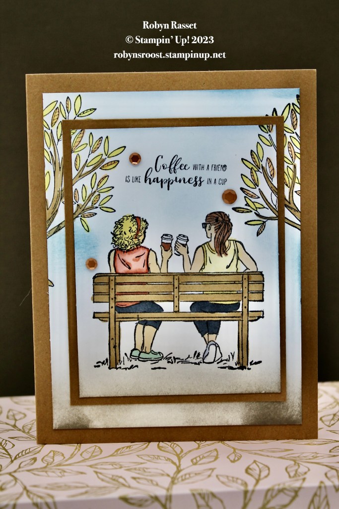 The main image is from the coffee with Friends stamp set and the trees are from the Growth Takes Time set, an online exclusive item. Three sequins are add because we girls need some bling!