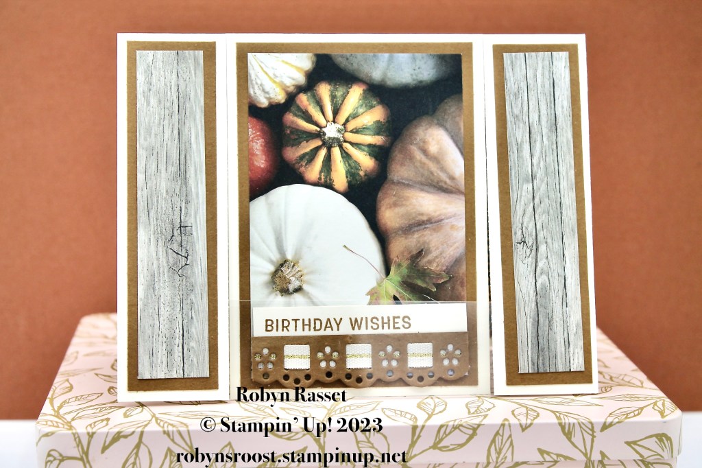 The gorgeous All About Autumn Designer Series Paper really becomes the star to this show. This paper is so darn popular that as soon as more comes in, it’s out of stock again! If you are waiting for it, the next batch is due in the week of October 23.