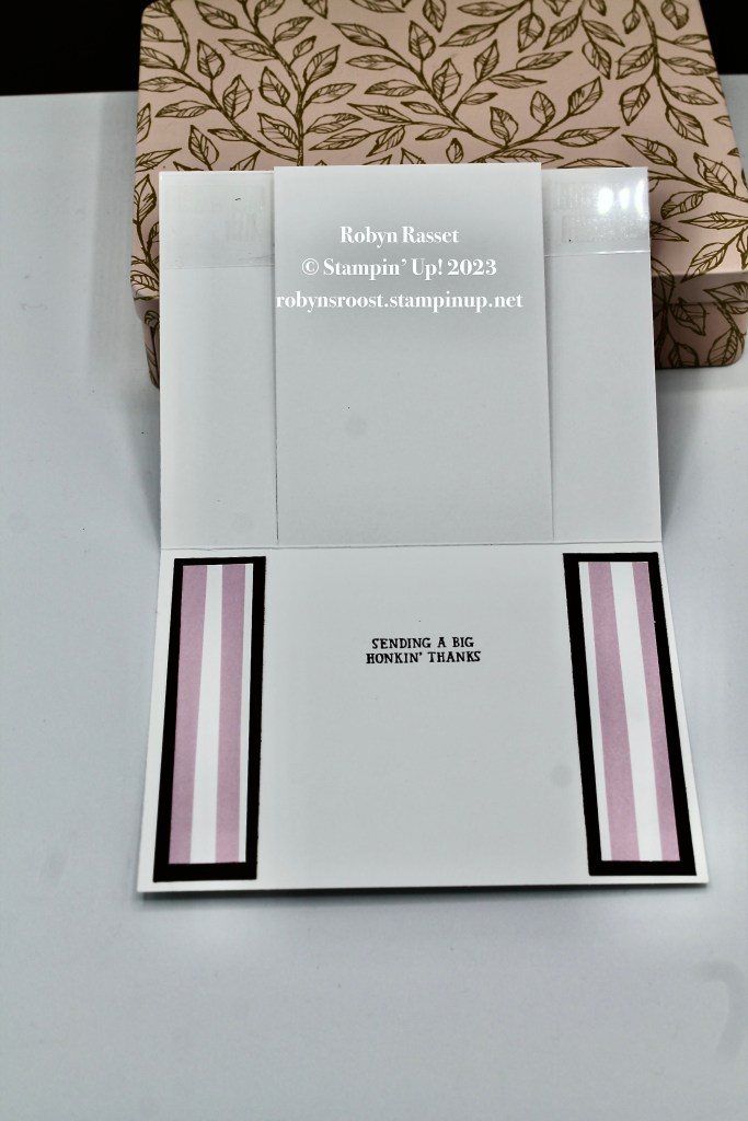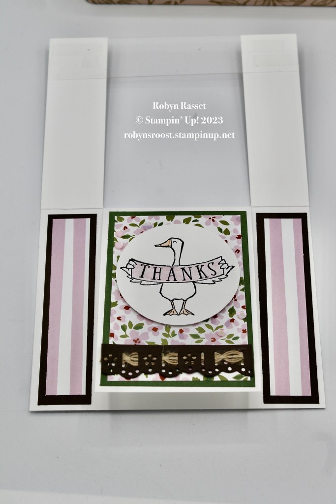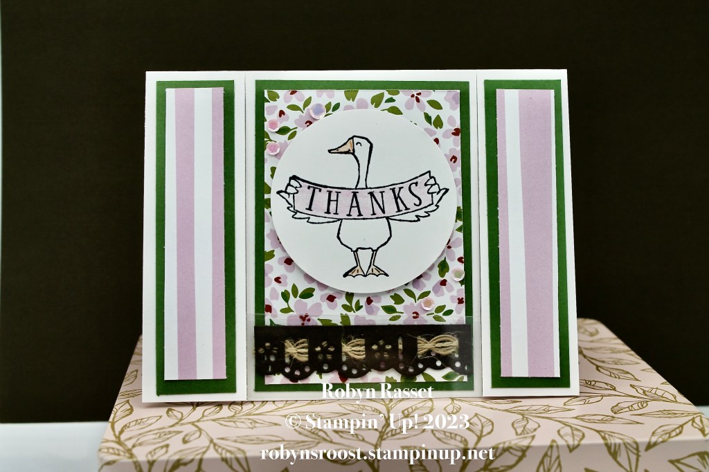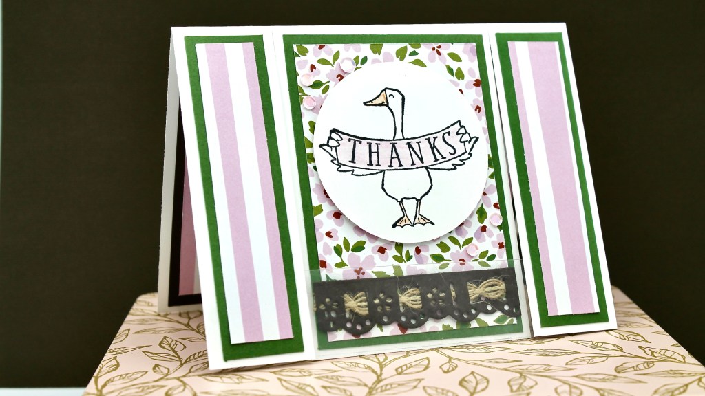 The Silly Goose sits on the center panel which has a Garden Green matte that is 2 3/4″ x 4″ and has a layer of the Delightfully Eclectic DSP (the opposite side of the striped paper) that is 2 1/2″ x 3 3/4″. The center layer lifts up to reveal a greeting area.