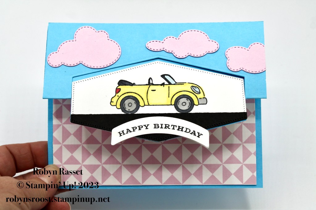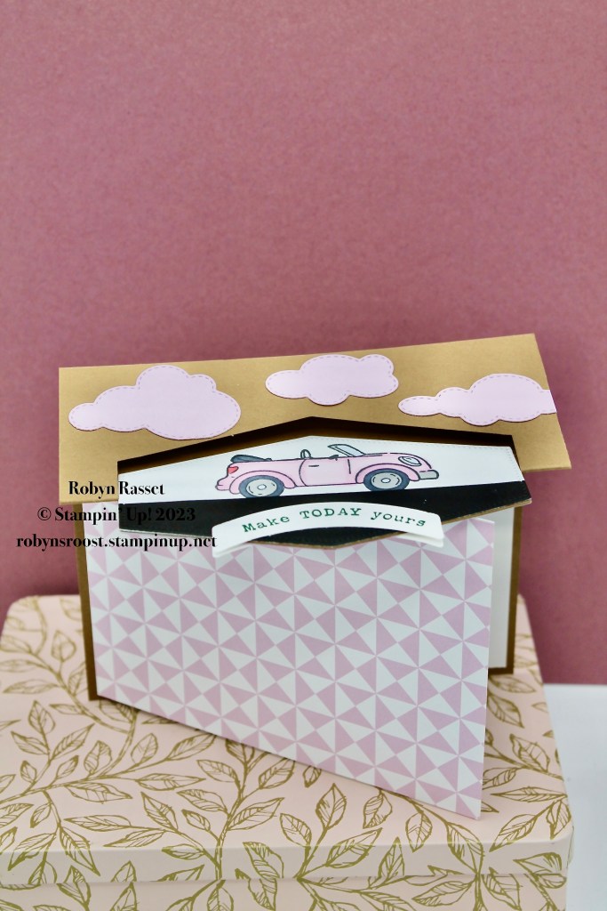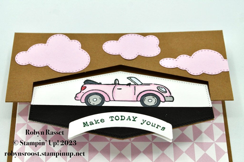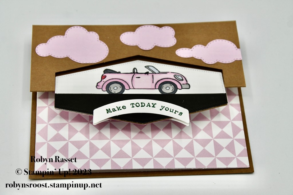 The first card uses a Pecan Pie and Bubble Bath color scheme with a little pink convertible.