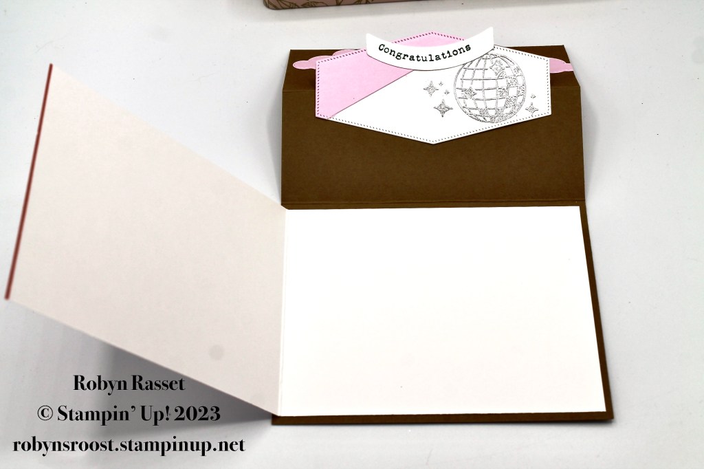 The inside of the card has a fold out for a large writing area. The Basic White layer is 10 1/2″ scored at 5 1/4″ x 4″. It has a pretty patterned paper (4″ x 5 1/4″) adhered to the top.